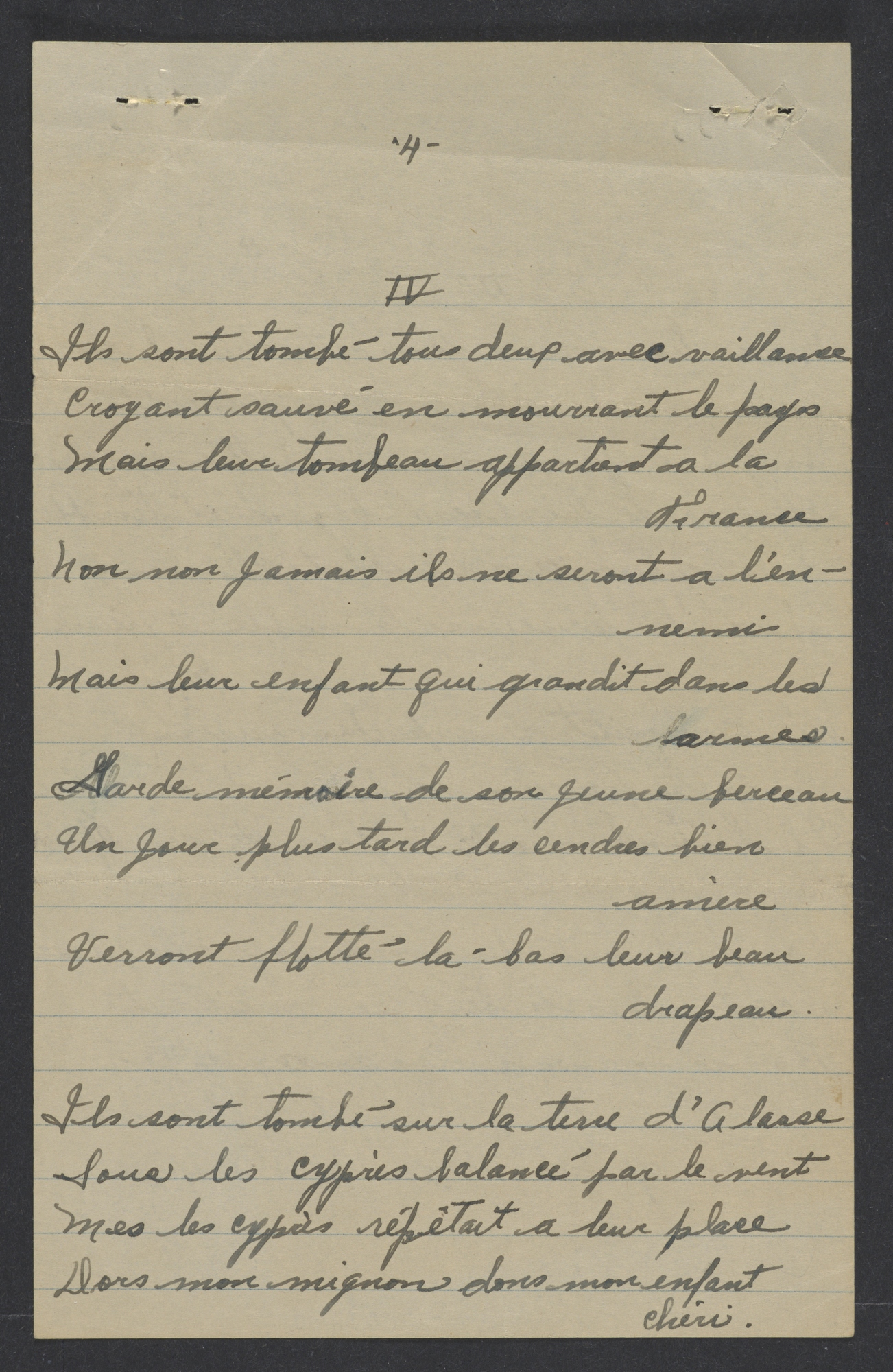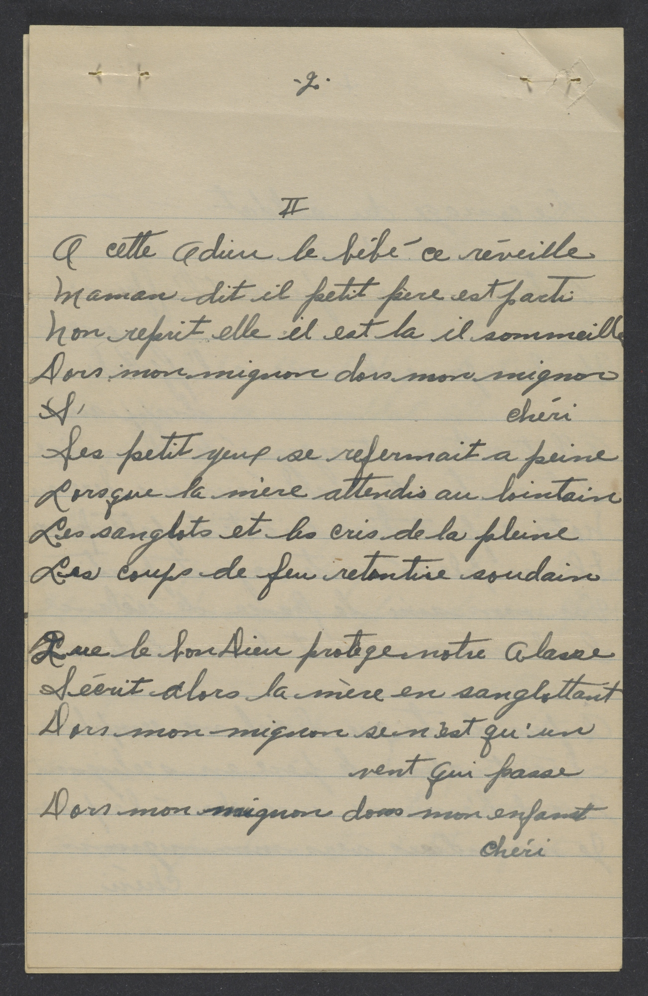 Looseleaf French language song text from VFC2011-0009 Desrosiers/Joyal Family Collection. MS2011-3114. Pp. 1-4.