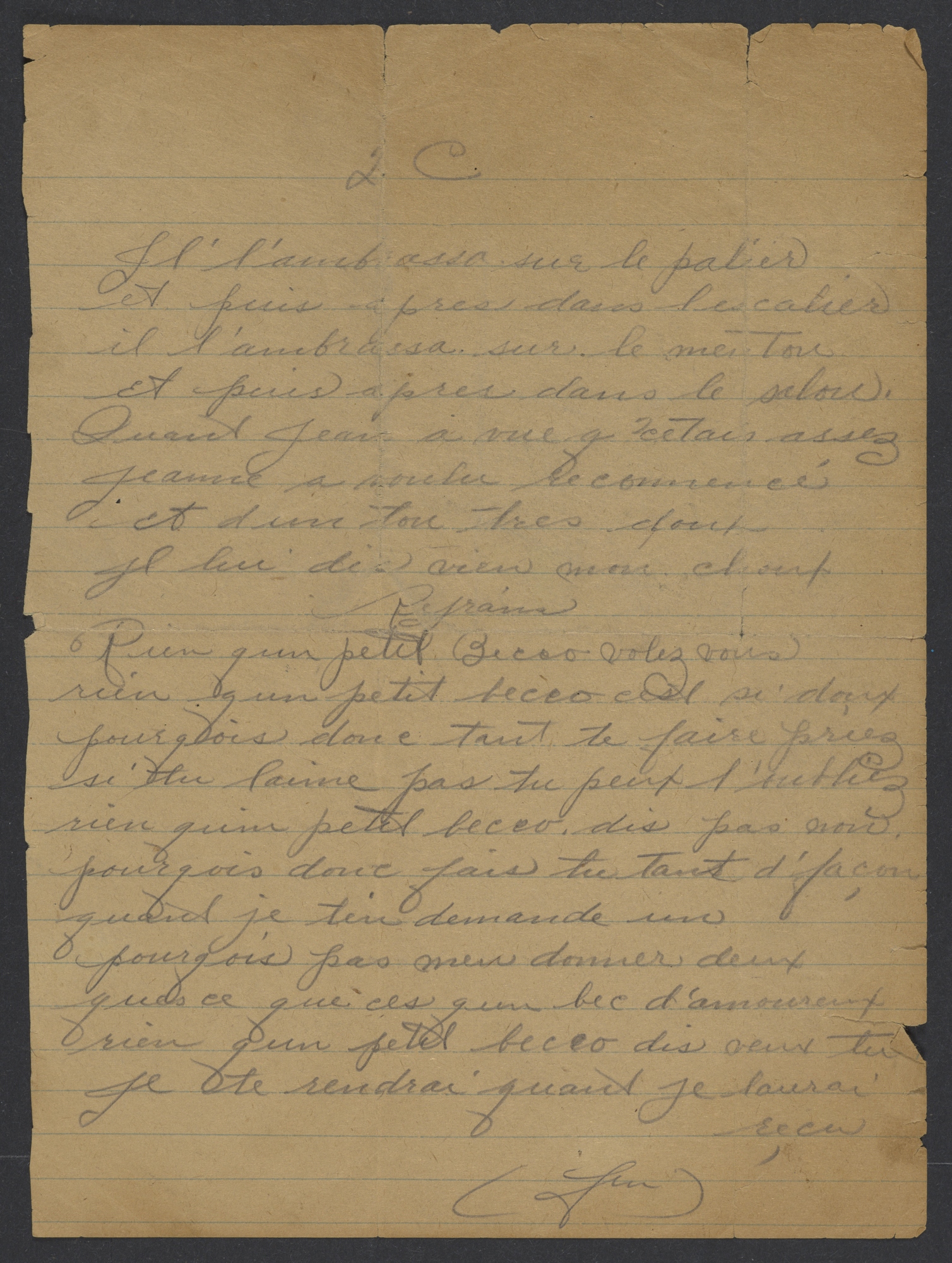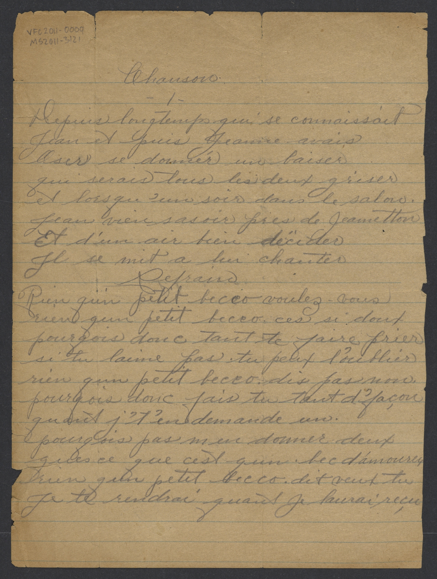 Looseleaf French language song text from VFC2011-0009 Desrosiers/Joyal Family Collection. MS2011-3121. Pp. 1-2.