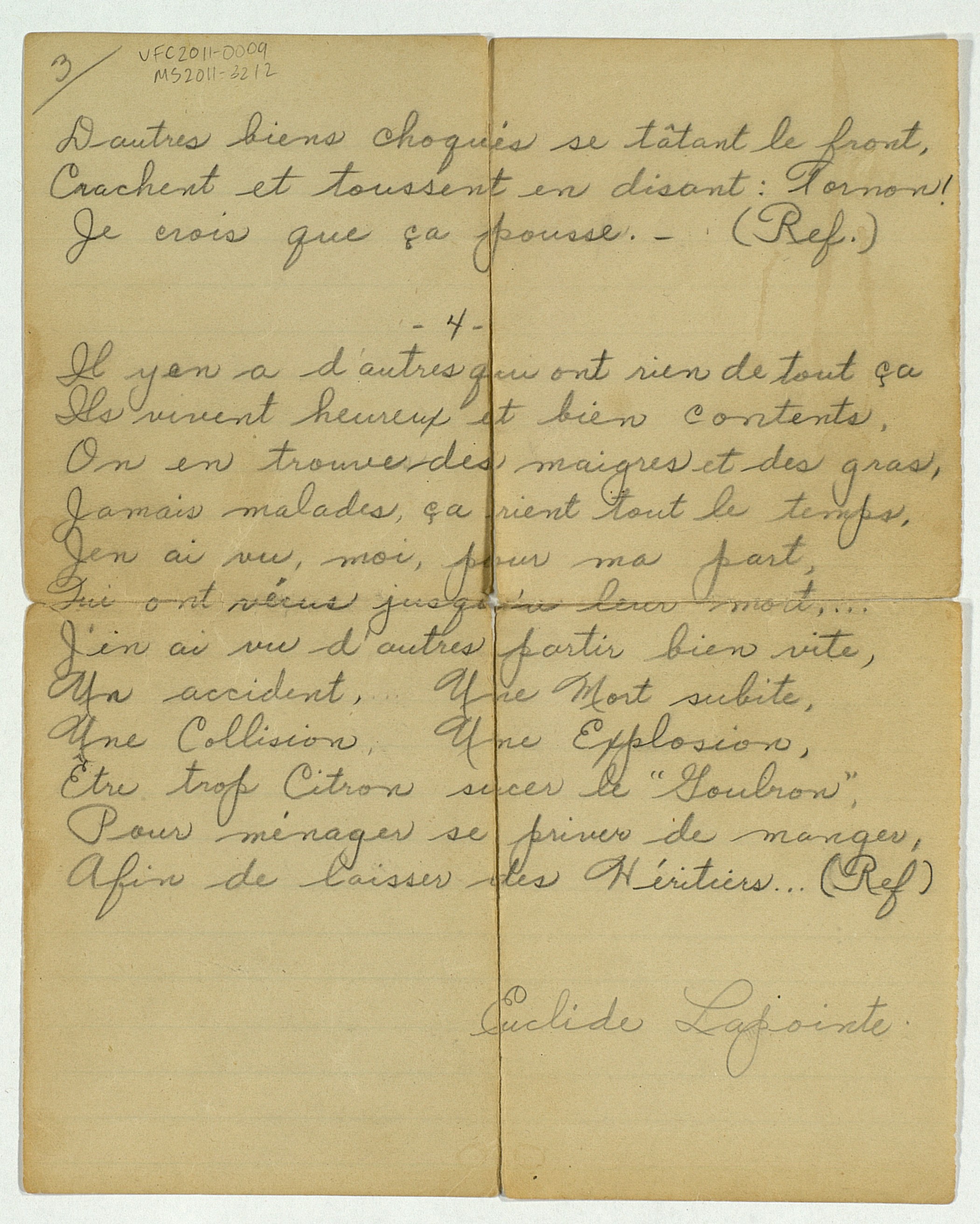 Looseleaf French language song text from VFC2011-0009 Desrosier Family Collection. MS 2011-3211.