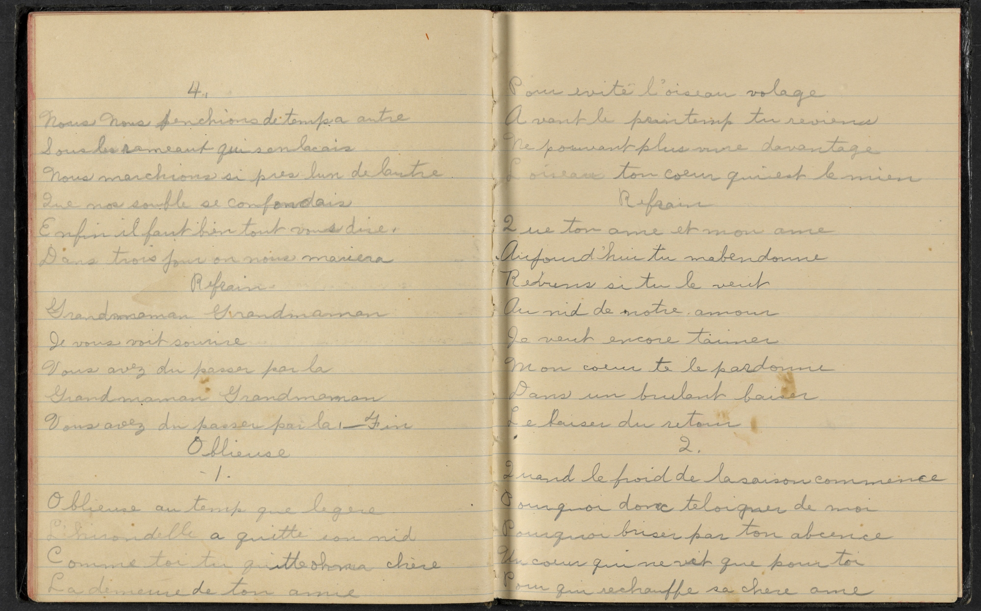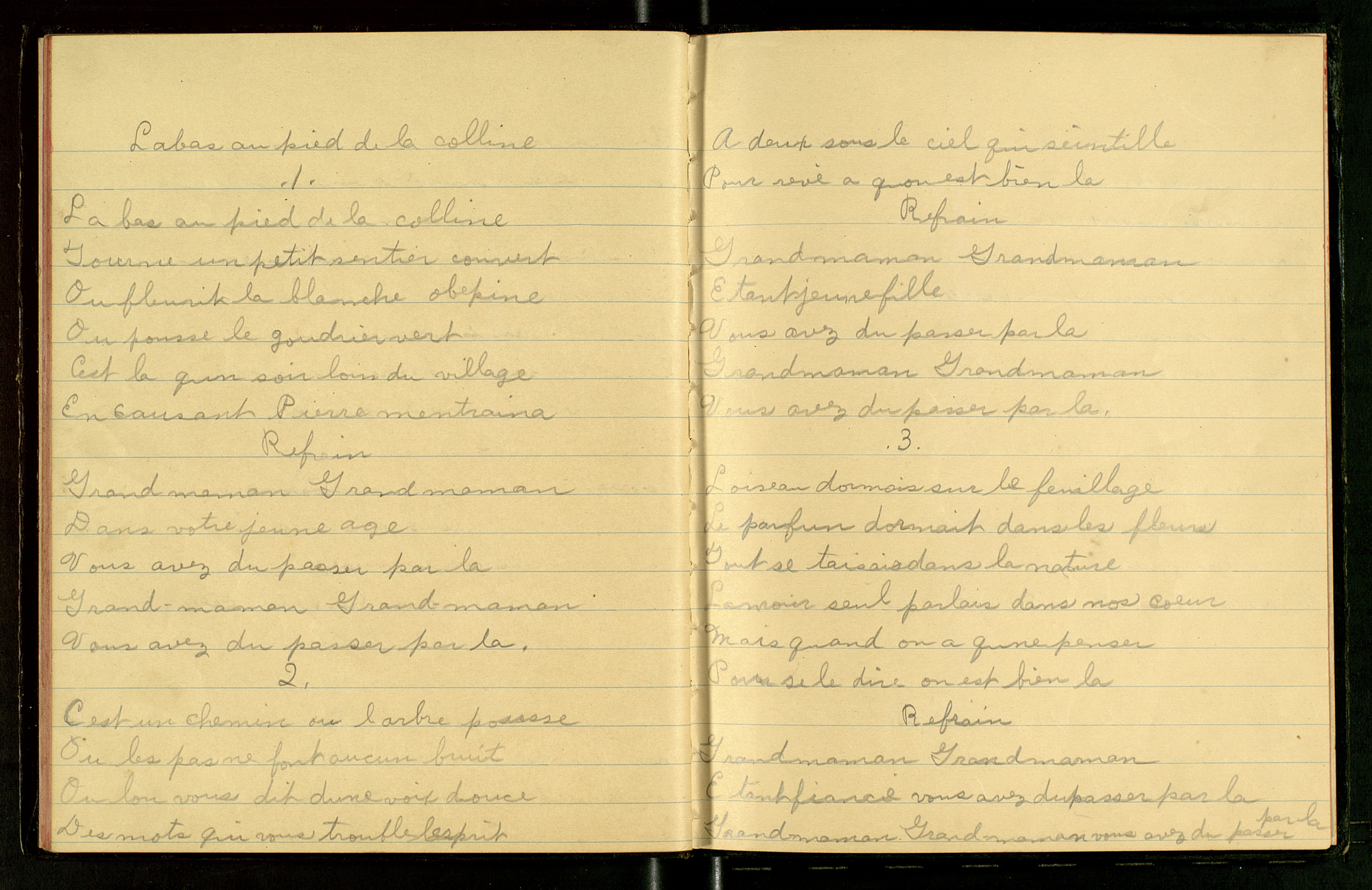 “Labas au pied de la colline” [Là-bas, au pied de la colline”; “Over There at the Foot of the HIll”] is a sentimental song composed in France or Quebec some time before 1936. Commonly known in Quebec as “Grand-maman” or “Grand’Maman,” the song is commonly attributed to (and was popularized in the early 1940s by) singer-songwriter and guitar player Roland LeBrun (aka “Le soldat Lebrun, 1919-1980), but its appearance in Eva Lacourse’s manuscript songbook indicates that the song was already in circulation before 1936.
