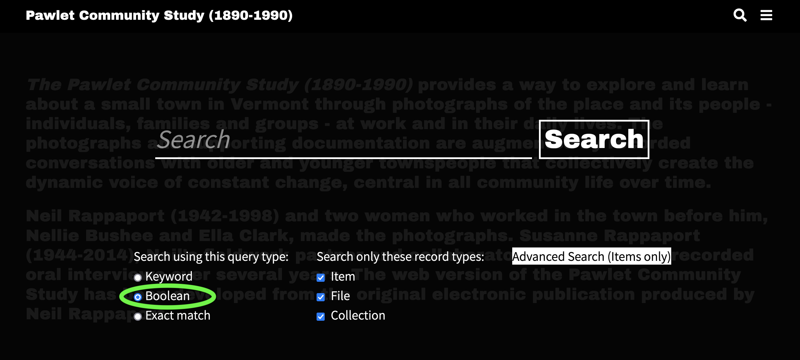 Selecting the "Boolean" radio button allows for simple Boolean searches using the operators AND, OR and NOT.